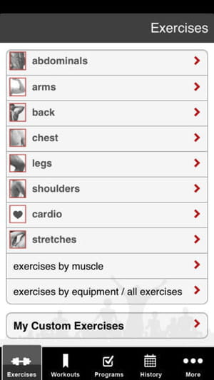 - Workouts are classified by target muscle groups, equipment required, and body region. This means that exercises vary greatly depending on the category selected. If, however, you have no equipment available or are more interested in cardio and stretching, there are over 40 exercise routines and stretches available requiring no extra equipment.