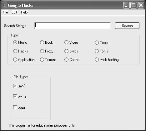 - Hacks - This option is most useful for experienced users who are looking for loopholes in their computer system. For example, entering a URL in the "Search String" and then choosing successively the radio buttons "Passwords" and "2", Google will search for the "auth_user_file.txt" string in the links. This can potentially find.Txt files containing sensitive data from users.